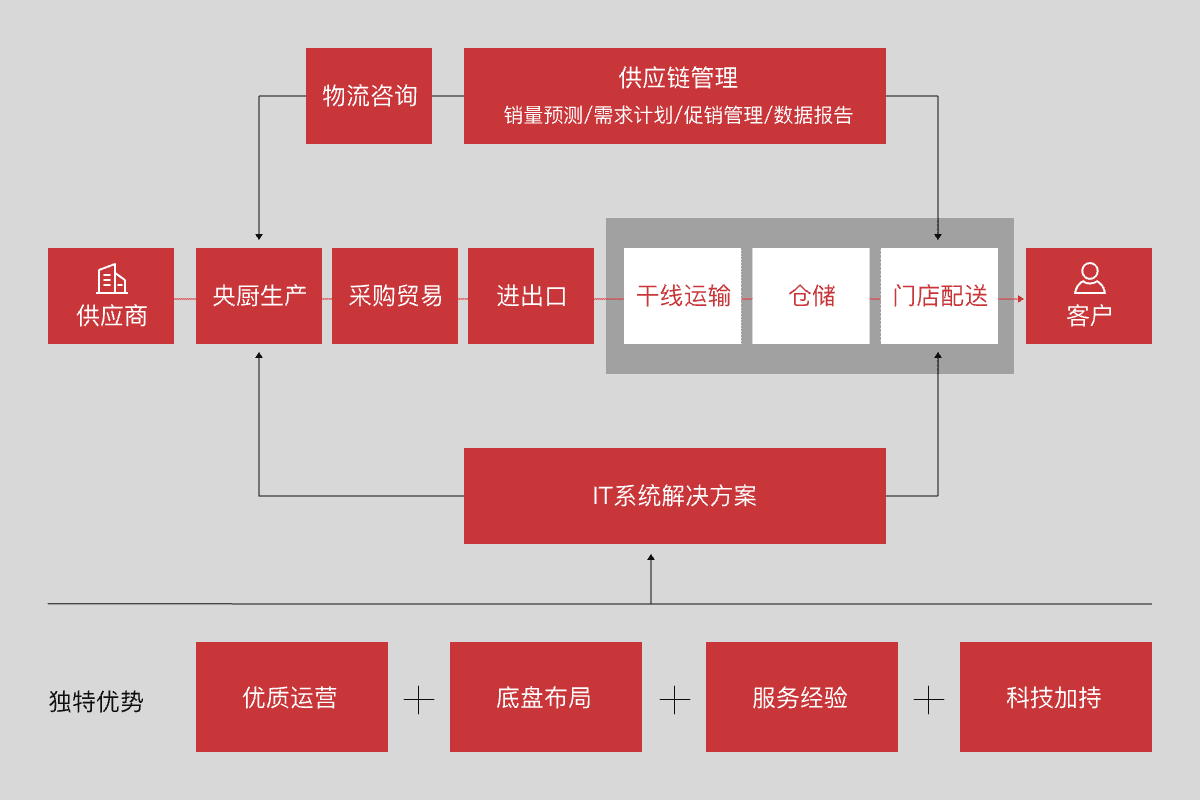基于餐饮和食品行业的多元化需求,以科技创新为驱动力,聚焦西式快餐、咖啡茶饮、零售/商超、中餐连锁、食品厂商等细分赛道,为国内外客户提供优质高效的央厨生产、采购贸易、进出口、冷链物流、供应链管理、科技解决方案(数字化、自动化)等全方位一体化服务解决方案